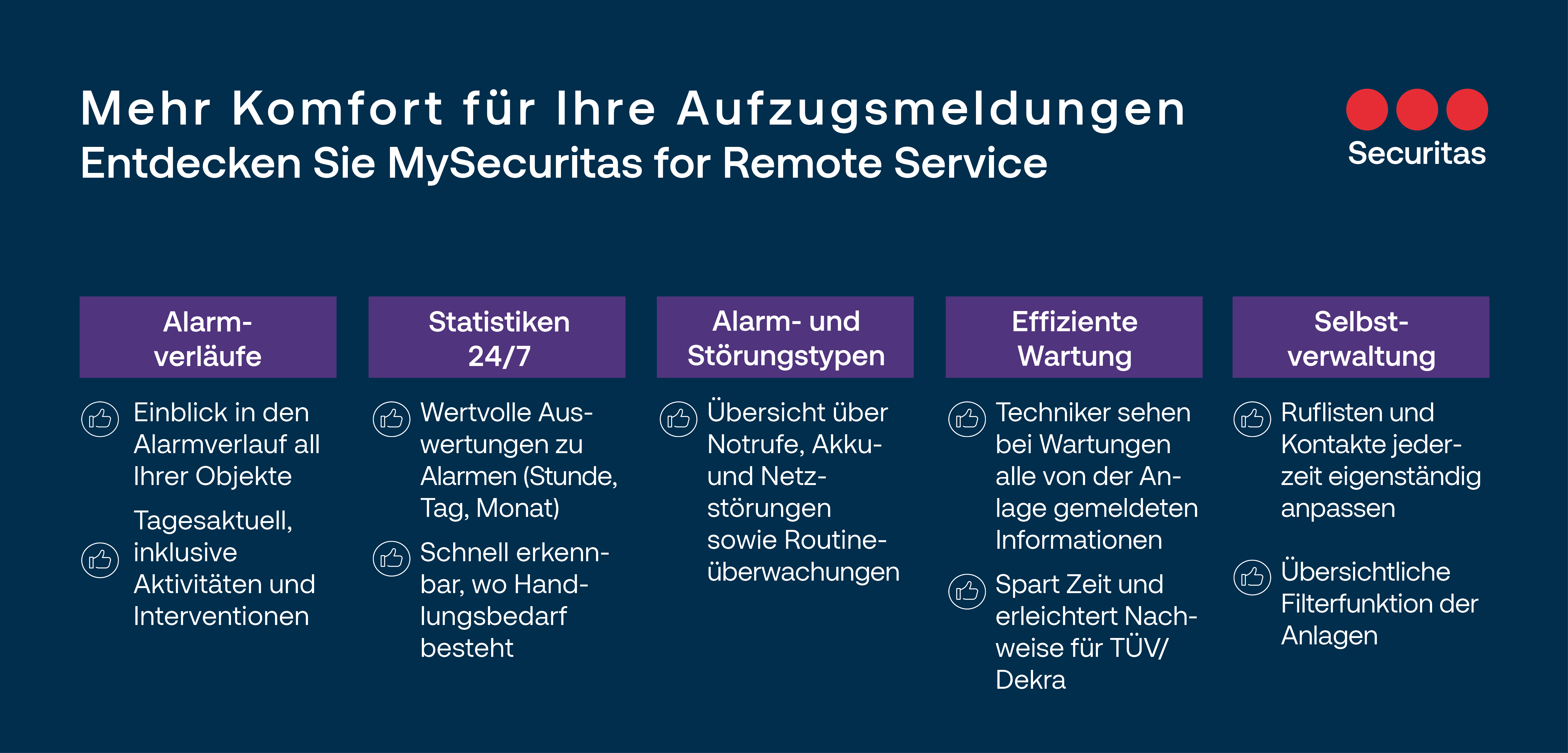 Wir bieten ein umfassendes, rund um die Uhr verfügbares Monitoring von Aufzuganlagen. Durch die Anbindung an die firmeneigene Notruf- und Serviceleitstelle setzen wir eine schnelle und professionelle Notfallreaktion um. Innerhalb von Sekunden identifizieren unsere Operatoren die Herkunft des Notrufs, ermittelt den genauen Standort und leiten umgehend Sofortmaßnahmen ein. Mit über 45.000 betreuten Aufzugsobjekten zählt das Monitoring von Aufzugsanlagen zu den größten und wichtigsten Geschäftsbereichen der Securitas Alert.